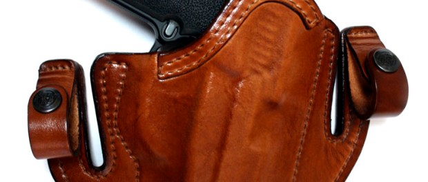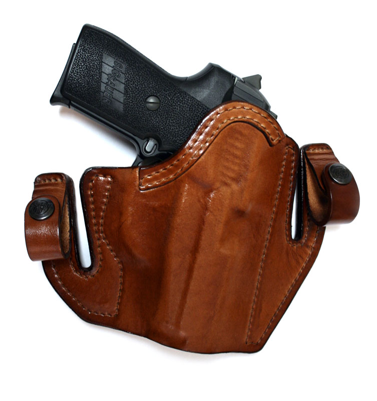 The Deep Concealment Tuckable IWB Holster may be worn as a normal IWB holster with a loose covering garment, as an IWB holster with the shirt tucked in over the pistol, or outside the waistband as a belt holster. It is available in brown or black leather, with optional suede or Alpha linings, and can be built with or without thumb-break retention.